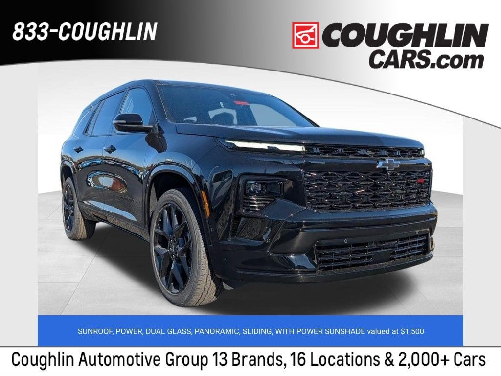 Price includes: $1000 - Chevrolet Bonus Cash. Exp. 03/02/2026 Please call for more information. If you don't see the car of your dreams in our huge inventory, chances are we can get it for you! 12 Speakers, 1st and 2nd Row All-Weather Floor Liners, 3 Years SiriusXM, 3rd Row All-Weather Floor Liner, 3rd row seats: split-bench, 4-Wheel Disc Brakes, 6-Way Power Front Passenger Seat Adjuster, 8-Way Power Driver Seat Adjuster, ABS brakes, Air Conditioning, Alloy wheels, AM/FM radio: SiriusXM with 360L, Apple CarPlay/Android Auto, Auto High-beam Headlights, Auto tilt-away steering wheel, Auto-dimming door mirrors, Automatic temperature control, Bose Premium 12-Speaker Audio System Feature, Brake assist, Bumpers: body-color, Child-Seat-Sensing Airbag, Compass, Delay-off headlights, Driver 4-Way Power Lumbar Seat Adjuster, Driver door bin, Driver vanity mirror, Dual front impact airbags, Dual front side impact airbags, Electronic Stability Control, Emergency communication system: OnStar, Exterior Parking Camera Rear, Floor Liner Package, Four wheel independent suspension, Front anti-roll bar, Front Bucket Seats, Front Center Armrest, Front dual zone A/C, Front Passenger 4-Way Power Lumbar Seat Adjuster, Front reading lights, Fully automatic headlights, Garage door transmitter, Heated door mirrors, Heated Driver and Front Passenger Seats, Heated front seats, Heated rear seats, Heated steering wheel, Illuminated entry, Integrated Cargo Liner, Low tire pressure warning, Memory seat, Navigation System, Occupant sensing airbag, Outside temperature display, Overhead airbag, Overhead console, Panic alarm, Passenger door bin, Passenger vanity mirror, Perforated Leather-Appointed Seat Trim, Power door mirrors, Power driver seat, Power Dual Glass Panoramic Sliding Sunroof, Power Liftgate, Power passenger seat, Power steering, Power windows, Preferred Equipment Group 2RS, Radio data system, Radio: : Audio System w/17.7 Diagonal Display, Rain sensing wipers, Rear air conditioning, Rear anti-roll bar, Rear reading lights, Rear window defroster, Rear window wiper, Remote keyless entry, RS Black Nameplate Kit (LPO), Security system, SiriusXM with 360L Trial Subscription, Speed control, Speed-sensing steering, Spoiler, Sport steering wheel, Steering wheel memory, Steering wheel mounted audio controls, Tachometer, Telescoping steering wheel, Tilt steering wheel, Traction control, Trip computer, Turn signal indicator mirrors, Variably intermittent wipers, Ventilated Driver and Front Passenger Seats, Ventilated front seats, Voltmeter, Wheels: 22 High Gloss Black Painted Aluminum.
