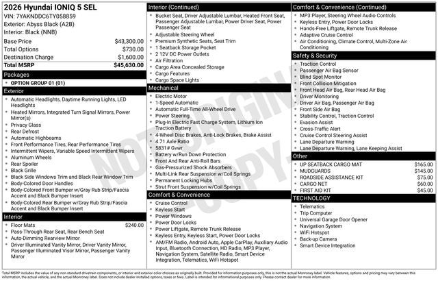 Priced below KBB Fair Purchase Price! 2026 Hyundai IONIQ 5 SEL 1-Speed Automatic Abyss Black ***This 2026 Hyundai IONIQ 5 SEL is a great choice***. 110/87 City/Highway MPG Price includes: $6000 - Hyundai HMF Dealer Choice: $6000 discount and 5.39% APR for 24 months. $44.05 per $1000 financed. Available to well qualified buyers who finance through Hyundai Motor Finance. H704. Exp. 03/31/2026