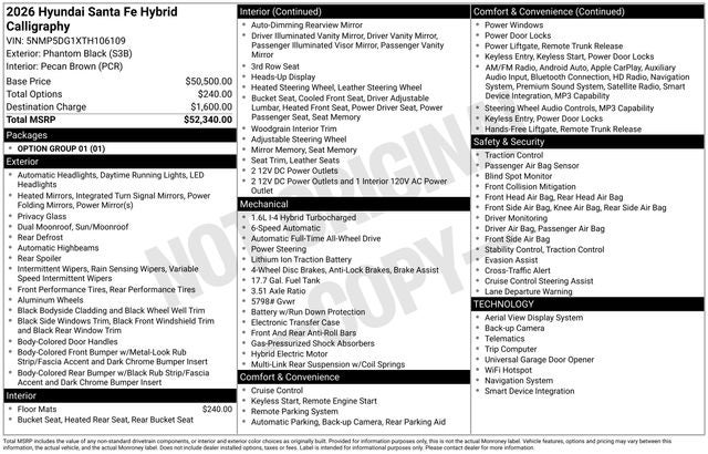 Priced below KBB Fair Purchase Price! 2026 Hyundai Santa Fe Hybrid Calligraphy 6-Speed Automatic with Shiftronic Phantom Black ***This 2026 Hyundai Santa Fe Hybrid Calligraphy is a great choice***. Price includes: $4000 - Hyundai HMF Dealer Choice : $4000 discount and 5.39% APR for 24 months. $44.05 per $1000 financed. Available to well qualified buyers who finance through Hyundai Motor Finance. H704. Exp. 03/02/2026