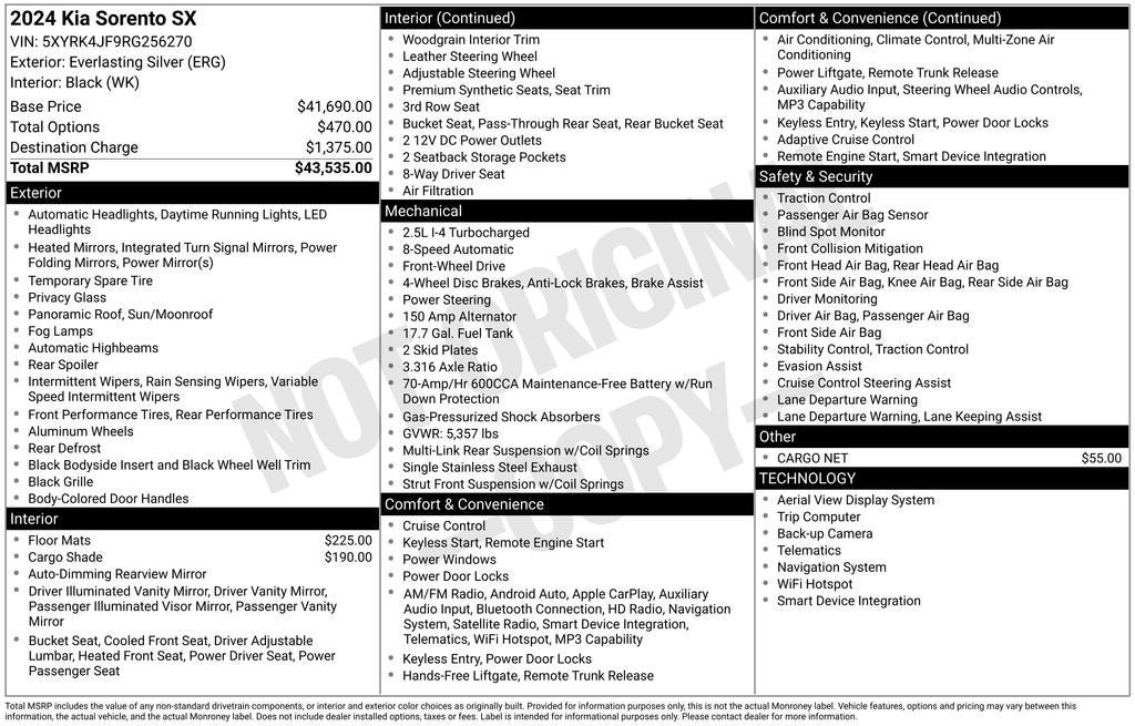 Everlasting Silver 2024 Kia Sorento SX FWD 8-Speed DCT 2.5L I4 DGI Turbocharged DOHC 16V LEV3-SULEV30 281hp