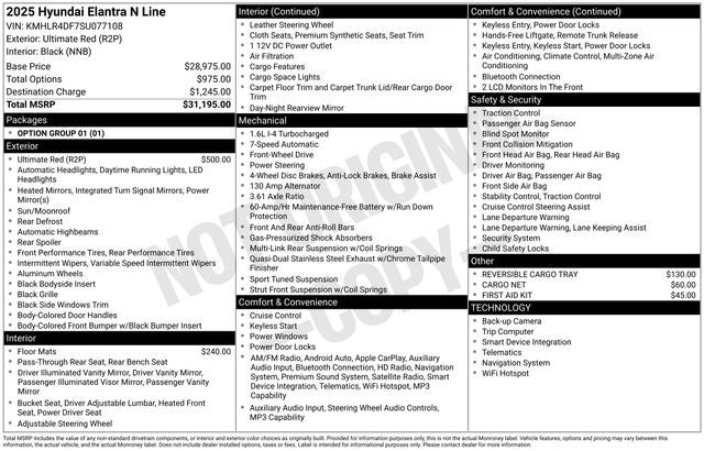 Priced below KBB Fair Purchase Price! 2025 Hyundai Elantra N Line 7-Speed Dual Clutch DCT Ultimate Red ***This 2025 Hyundai Elantra N Line is a great choice***. 28/35 City/Highway MPG Price includes: $750 - Hyundai HMF Dealer Choice : $750 discount and 5.39% APR for 24 months. $44.05 per $1000 financed. Available to well qualified buyers who finance through Hyundai Motor Finance. H704. Exp. 03/02/2026