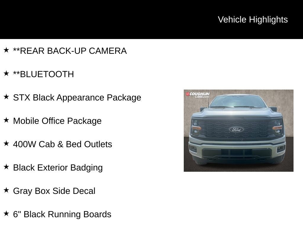 Whether you're tackling a job site, hauling gear, or just enjoying the open road, the 2025 Ford F-150 STX 4X4 is the perfect companion. Experience the uncompromising capability and versatility that have made the F-150 a trusted name in the world of trucks. Visit our showroom today and let us demonstrate how this exceptional vehicle can transform the way you work and play. Price includes: $1250 - Retail Bonus Cash. Exp. 03/31/2026 $2000 - Retail Customer Cash. Exp. 03/31/2026 $500 - Retail Bonus Cash. Exp. 03/31/2026