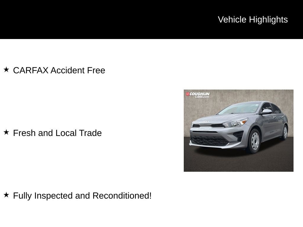 Whether you're seeking an efficient, well-equipped daily driver or a practical and affordable compact sedan, this 2022 Kia Rio S is an exceptional choice. Experience the difference for yourself and schedule a test drive today at Coughlin Kia of Lewis Center.