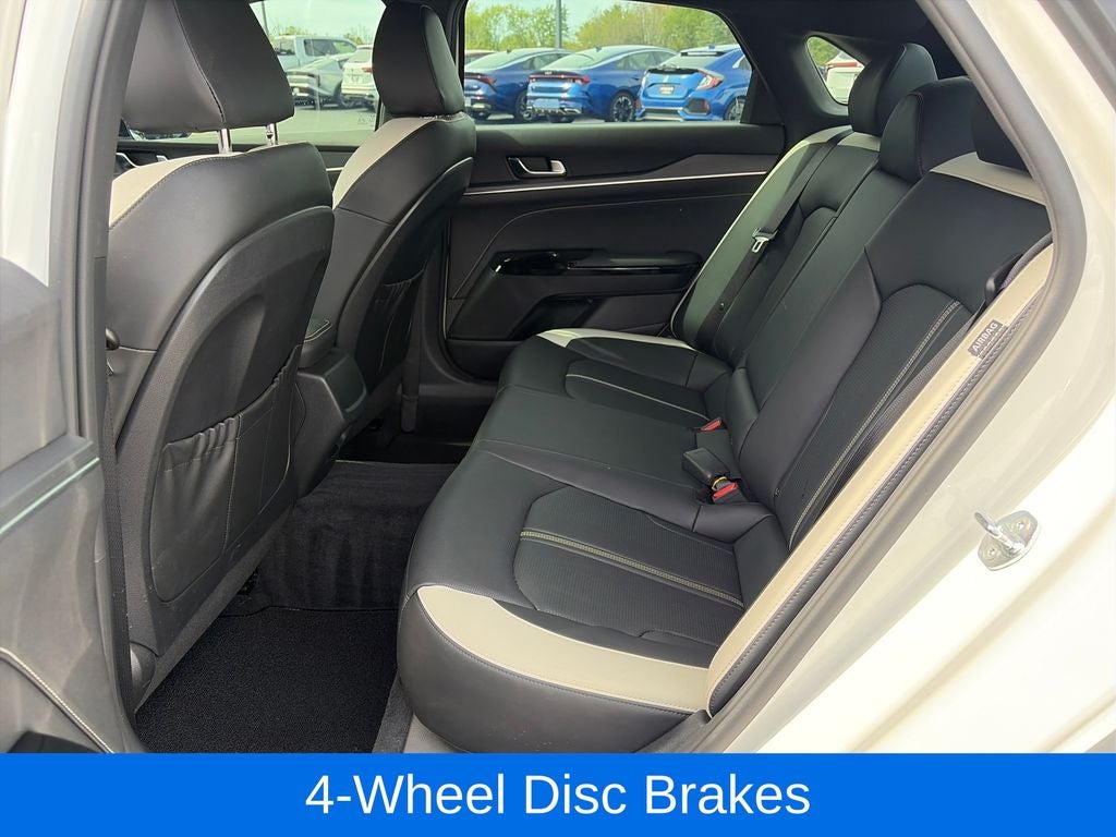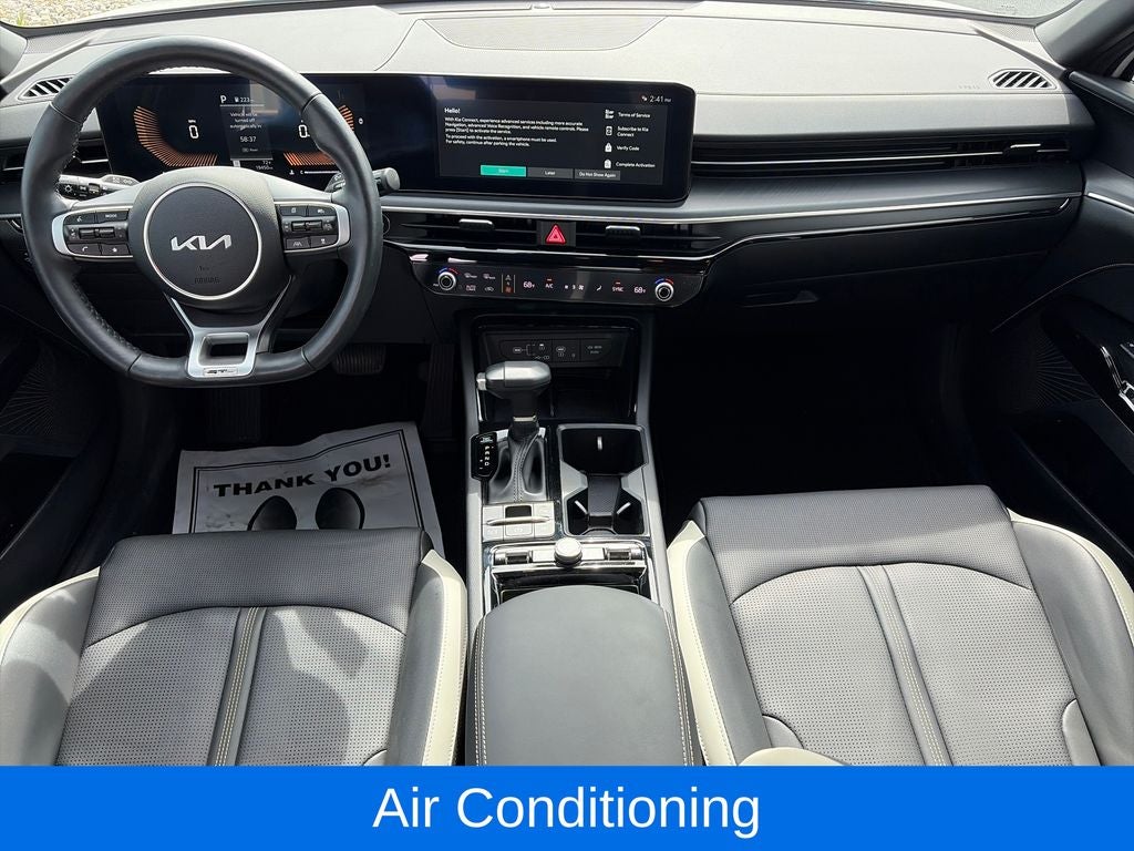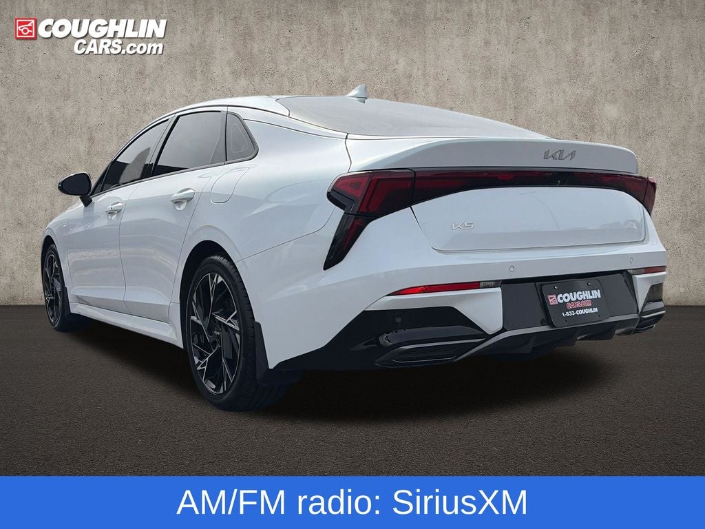 Certified. Snow White Pearl 2025 Kia K5 GT-Line AWD 8-Speed Automatic I4 K5 GT-Line, 4D Sedan, I4, 8-Speed Automatic, AWD, Snow White Pearl, Black w/SynTex Seat Trim, 4-Wheel Disc Brakes, 6 Speakers, ABS brakes, Air Conditioning, Alloy wheels, AM/FM radio: SiriusXM, Auto High-beam Headlights, Automatic temperature control, Brake assist, Bumpers: body-color, Carpeted Floor Mats, Delay-off headlights, Driver door bin, Driver vanity mirror, Dual front impact airbags, Dual front side impact airbags, Electronic Stability Control, Emergency communication system: Kia Connect (includes 1 year free trial), Four wheel independent suspension, Front anti-roll bar, Front Bucket Seats, Front Center Armrest, Front dual zone A/C, Front fog lights, Front reading lights, Fully automatic headlights, Heated door mirrors, Heated Front Bucket Seats, Heated front seats, Heated steering wheel, Illuminated entry, Knee airbag, Leather Shift Knob, Leather steering wheel, Low tire pressure warning, Navigation System, Occupant sensing airbag, Outside temperature display, Overhead airbag, Overhead console, Panic alarm, Passenger door bin, Passenger vanity mirror, Power door mirrors, Power driver seat, Power steering, Power windows, Radio data system, Radio: AM/FM Audio System, Rear anti-roll bar, Rear seat center armrest, Rear side impact airbag, Rear window defroster, Remote keyless entry, Security system, Speed control, Speed-sensing steering, Split folding rear seat, Sport steering wheel, Steering wheel mounted audio controls, Tachometer, Telescoping steering wheel, Tilt steering wheel, Traction control, Trip computer, Turn signal indicator mirrors, Variably intermittent wipers, Wheels: 18 x 7.5J Gloss Black Machined Finish Alloy.