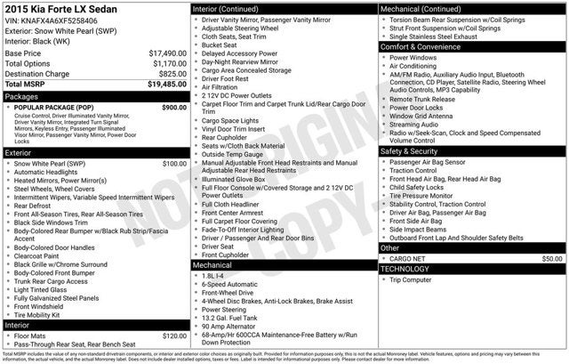 Snow White Pearl 2015 Kia Forte LX 26/39 City/Highway MPG